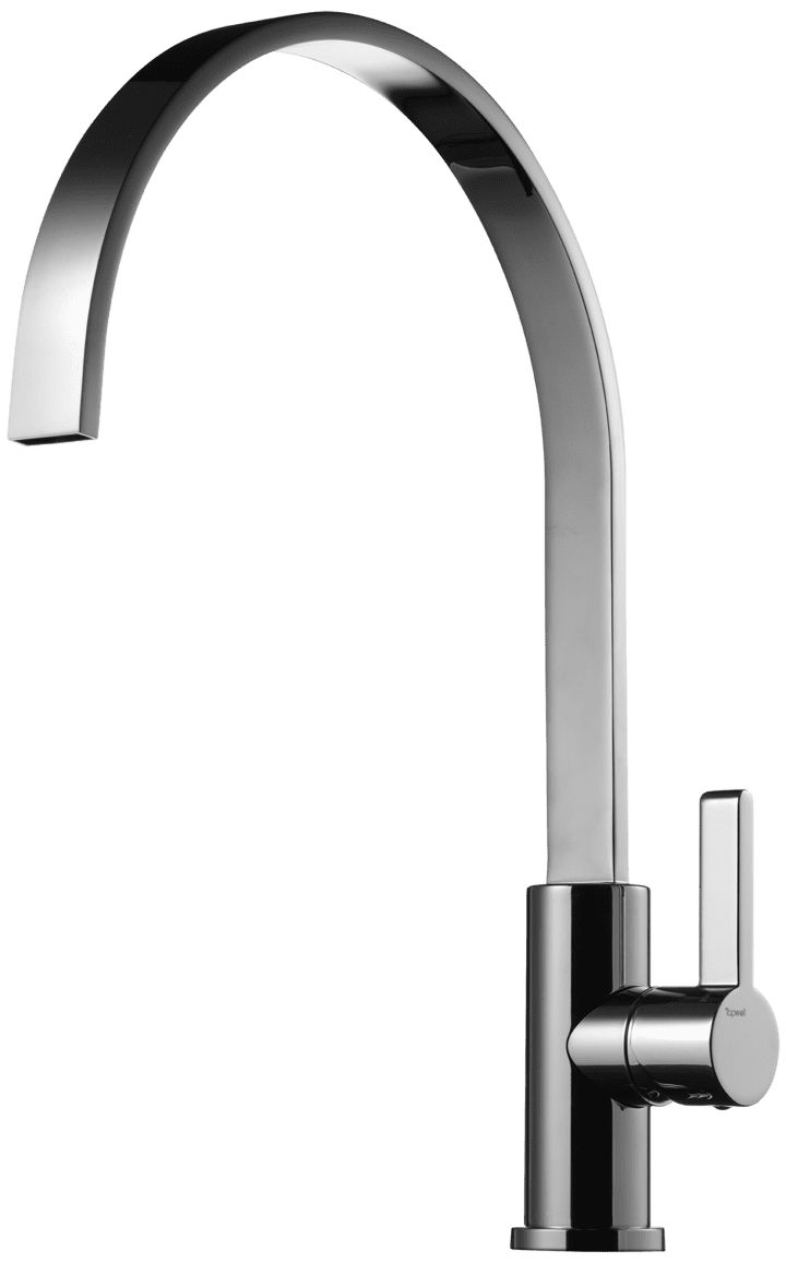 Minimalistinis Virtuvinis maišytuvas su plonu sukiojamu kranu.