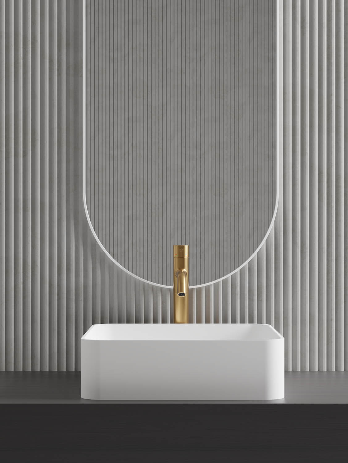 Laisvai pastatomas praustuvas pagamintas iš tvirtos ir įbrėžimams atsparios kompozito medžiagos. Suapvalintos kvadrato formos, matinės baltos spalvos dubuo, kuriame dera minimalistiniai ir geometriniai dizaino elementai. Kiekvienas praustuvas yra rankų darbo ir turi savo unikalų charakterį. Apatinio vožtuvo spalvą galima derinti su maišytuvo spalva.