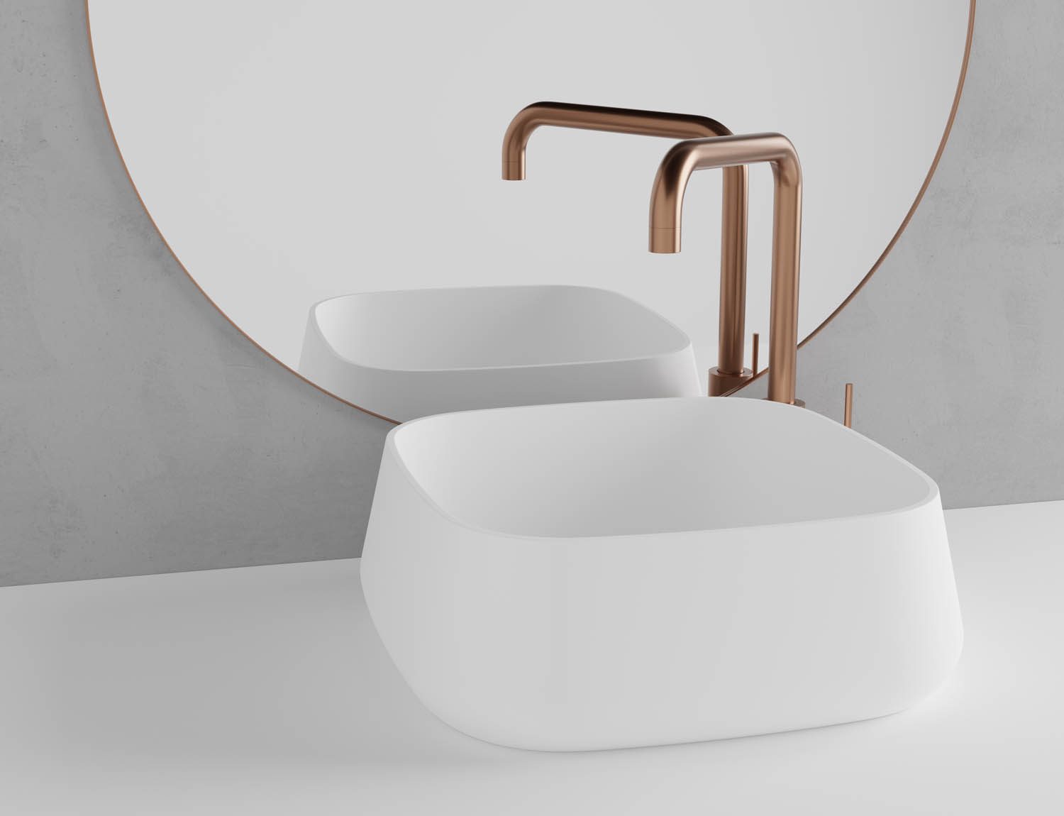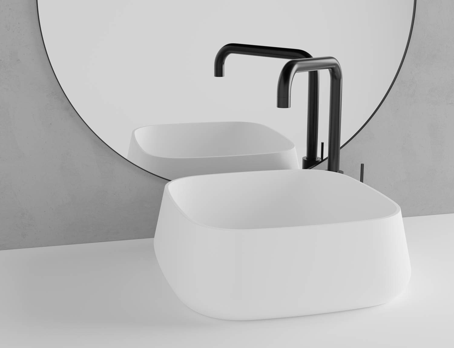 Laisvai pastatomas praustuvas pagamintas iš tvirtos ir įbrėžimams atsparios kompozito medžiagos. Suapvalintos kvadrato formos, matinės baltos spalvos dubuo, kuriame dera minimalistiniai ir geometriniai dizaino elementai. Kiekvienas praustuvas yra rankų darbo ir turi savo unikalų charakterį. Apatinio vožtuvo spalvą galima derinti su maišytuvo spalva.